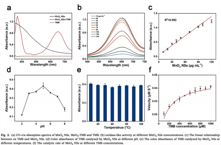 纳米酶,是具有类酶特性的纳米材料,是优秀的信号报告分子而被广泛应用于生物传感检测,治疗等领域。MnO2作为一种有前途的纳米材料因其形貌多样性和制备简单,独特的光学性质、吸附能力和优异的催化性能得到广泛研究,因此二维MnO2 NSs是无标记ICA的理想标签。