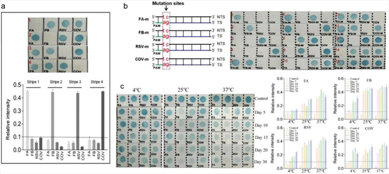 为了验证CRISPR-RDB体系的可行性,作者先将4种recDNA和4种capDNA杂交,结果表明每条带有4种capDNA的尼龙膜可识别到对应的recDNA,且recDNA I、II、III和IV之间没有干扰。 同时,作者测试了4个具有不同靶标序列识别能力的Cas12a/crRNA系统,显示能够在特异靶标存在的情况下剪切对应的recDNA。